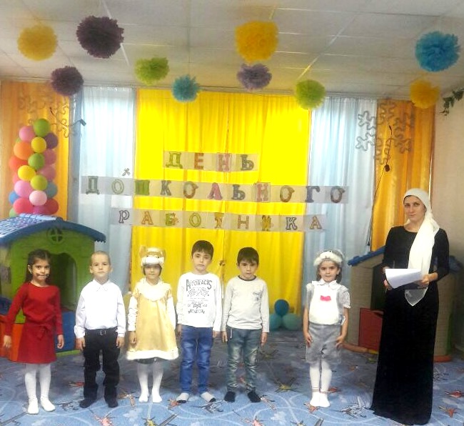 27.09.2017Дошкольный возраст — особенно важный и ответственный период в жизни ребенка, в этом возрасте формируется личность, и закладываются основы здоровья. Благополучное детство и дальнейшая судьба каждого ребенка зависит от мудрости воспитателя, его терпения, внимания к внутреннему миру ребенка. С помощью своих воспитателей дошкольники познают секреты окружающего мира, учатся любить и беречь свою Родину. В этот день и у нас в МБДОУ №1 «Ласточка» г.Аргун» прошел мероприятие, посвященное ко Дню работников дошкольных образовательных учреждений. Дети читали стихи, прошел утренник в старшей группе № 2 «Светлячок». Прошла фотовыставка воспитателей с детьми. Мы поздравляем с праздником всех работников дошкольных учреждений, отдающих ежедневно тепло своих сердец детям! Мы уверены, что ваша доброта и педагогическое мастерство превратят каждый день для воспитанников в детском саду в день радости и счастья! Сегодня день особенный, забыть о нем нельзя.